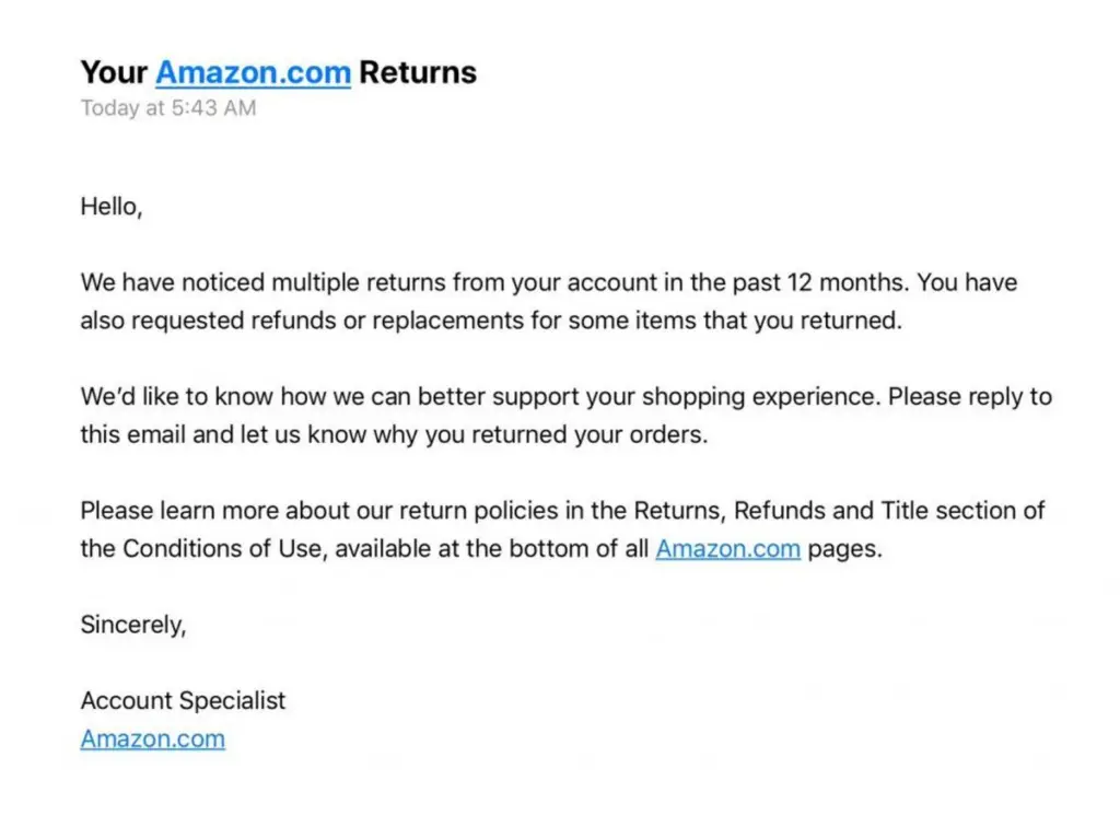 We want to call your attention to our returns policies because repeated misuse can result in the closure of your Amazon account,” the email continued.